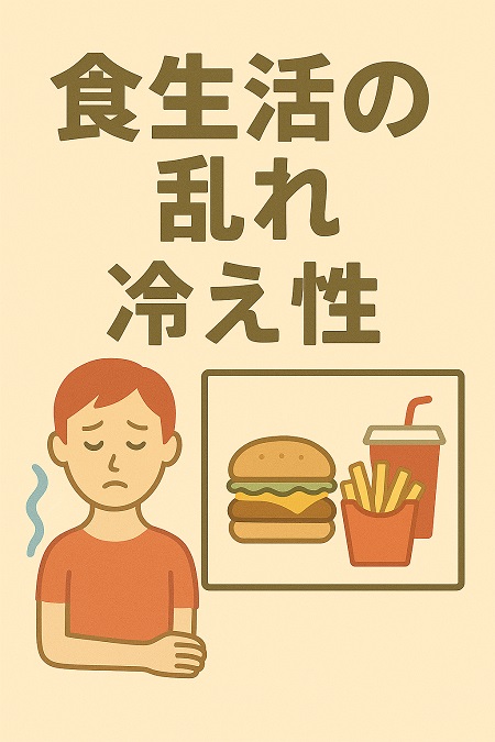 ビタミンやミネラル不足や、暴飲暴食により胃腸に血流が集中することで末梢の血流不良が起こったり、冷たいもののとりすぎで体(胃腸)が冷えたり、極端な食事制限などで血行不良や筋肉量が低下し冷え性が起こります。