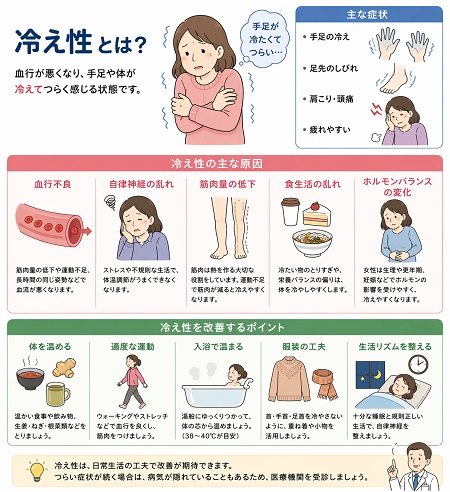 過剰なストレス、過労、不規則な生活、睡眠不足が原因で自律神経が乱れ、交感神経が優位になることで末梢血管が収縮して血行不良になり冷え性が起こります。