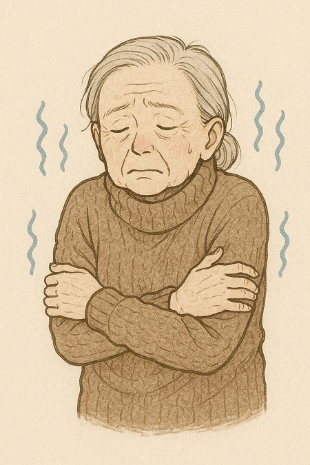 筋力低下により、熱産生が不十分になります(筋肉は体温の約6割を生み出す)。