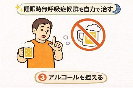 睡眠時無呼吸症候群を自力で治す方法として、就寝4時間前までを目安に就寝前の飲酒(アルコール)を控えることや、お酒(アルコール)の量を減らす事が重要です。 アルコールを控えることで喉、舌や咽頭筋の弛緩を防ぎ気道を広げ、無呼吸の悪化を防ぐ効果が期待できます。またアルコールを控えることで睡眠が浅くなるのを防ぎ、熟睡感が増すことで睡眠の質が向上し、日中の眠気や高血圧、不整脈、動脈硬化などの合併症リスクが軽減されます。