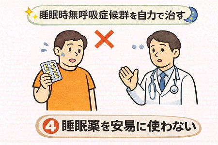 睡眠時無呼吸症候群を自力で治す方法として、熟睡感がない、眠れない、日中眠い(寝ても疲れが取れない)からといって、安易にベンゾジアゼピン系などの筋弛緩作用のある睡眠薬を服用しないことをお勧めします。 睡眠薬を服用することによってのどの筋肉が緩んで気道が塞がりやすくなり、睡眠時無呼吸症候群の症状が悪化します。