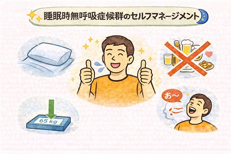 睡眠時無呼吸症候群の治療として生活習慣の見直しなど、睡眠時無呼吸症候群の症状を軽減することはできます。まずは睡眠時無呼吸症候群の診断を受け、原因と改善策を医師に相談してください。