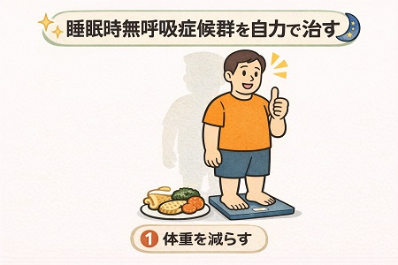 睡眠時無呼吸症候群を自力で治す一番有効な方法は減量です。減量することで気道の脂肪が減り、広がりやすくなるため睡眠時無呼吸症候群の症状が大幅に改善します。 減量の効果は体重が10%が減ると無呼吸の回数(AHI)が約26%減ると言われています。