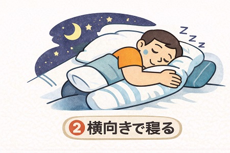 横向きで寝ることで、気道が確保されやすくなり、無呼吸の改善に繋がる場合がありますので、抱き枕などを使って、楽な姿勢を見つけてみましょう。
