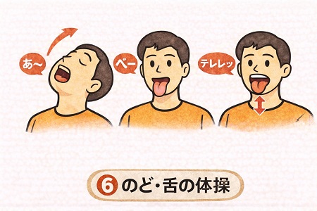 「あー」「いー」「うー」「べー」と口を大きく動かし、特に「う」で舌を突き出し、「べ」で舌を出す。3セットを目安に。
