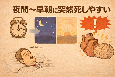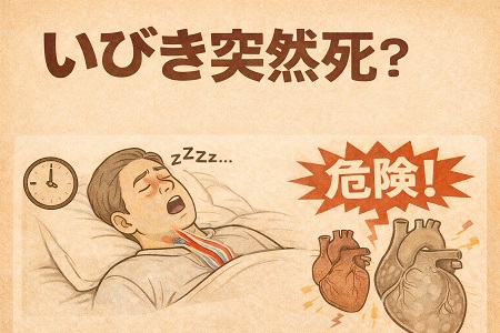 (睡眠時無呼吸症候群の人は、健康な人に比べて夜間の突然死発生率が2.6倍といわれており、夜間の突然死の原因の大半は急性心筋梗塞です)