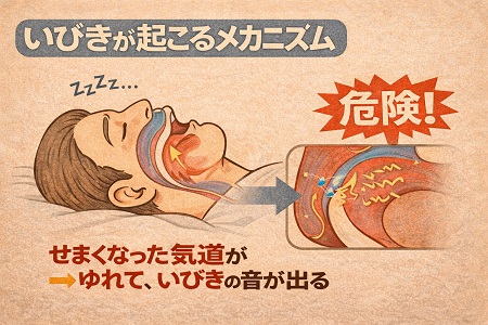 上記のような因子によって、気道が狭くなることで、睡眠時無呼吸症候群を発症します(閉塞性睡眠時無呼吸症候群)。