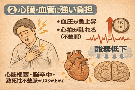 睡眠時無呼吸症候群による無呼吸状態によって全身に酸素が行き渡らなくなると、心臓に大きな負担がかかり、心筋梗塞を引き起こして死に至る恐れがあります。