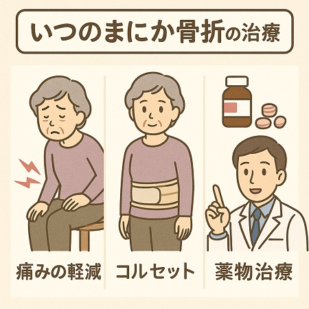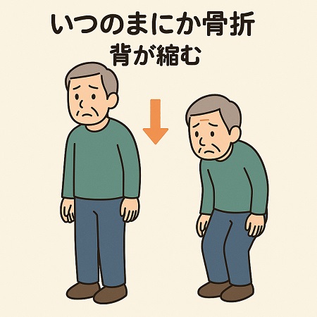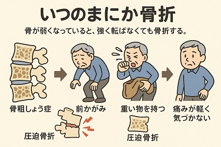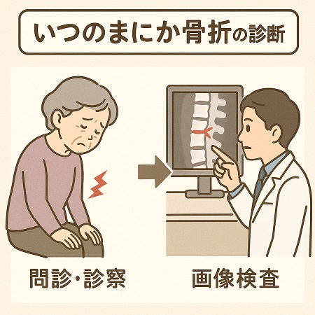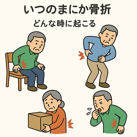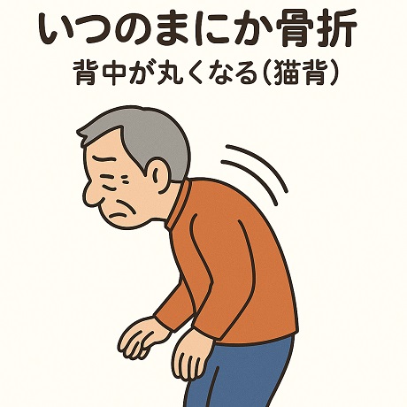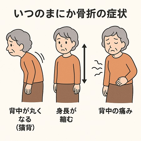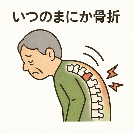 転んだり、けがをしたわけでもないのに、腰に痛みや、背中の違和感が続くのはいつのまにか骨折しているかもしれません。