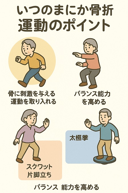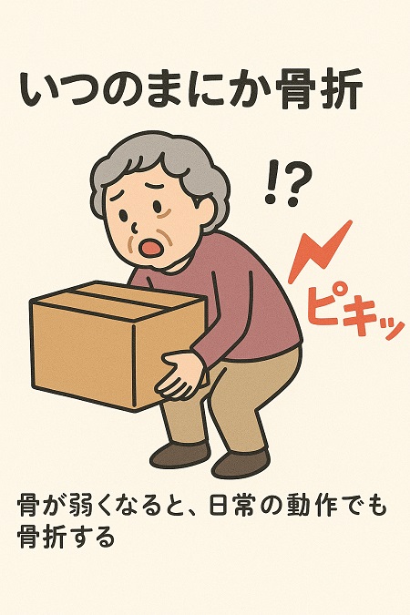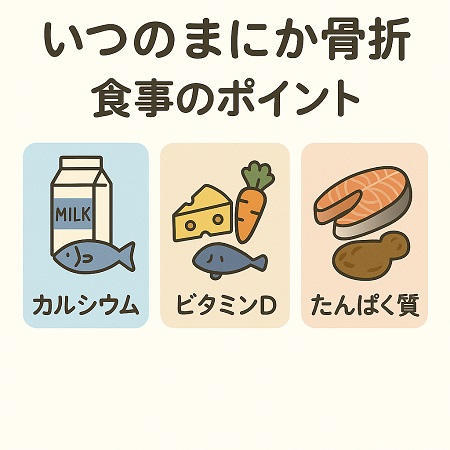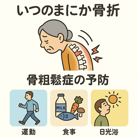 いつのまにか骨折した原因が骨粗鬆症骨粗鬆症だった場合には食事(カルシウム、ビタミンD、Kの積極的な摂取)、運動(ウォーキング、筋トレ、骨に刺激を与える運動)、生活習慣の改善(禁煙、節酒、日光浴)が重要です