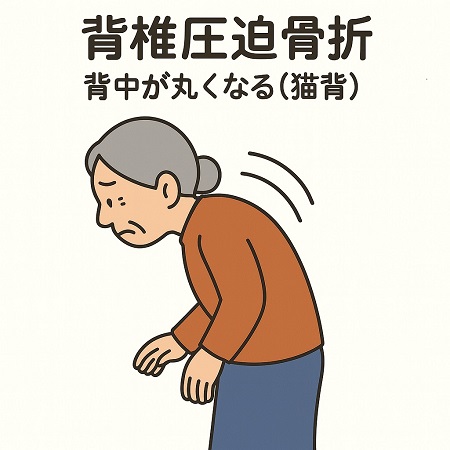 いつのまにか骨折:椎体に骨折が起こると、その上下の椎体にもドミノ倒しのように骨折が拡がります。いつのまにか背骨の変形が進み、背中や腰が曲がり、猫背になってしまいます。 背中を伸ばせない、背中全体の痛みや重苦しい感じ、身長が縮んだなどの症状は隠れた圧迫骨折のサインです。