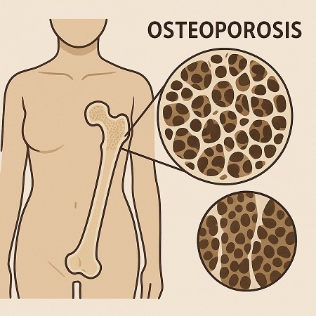 骨粗鬆症(骨粗しょう症)とは加齢、エストロゲン不足(女性ホルモンの減少)、ビタミンDやカルシウムの摂取不足や病気(慢性腎臓病、内分泌疾患、甲状腺機能亢進症、糖尿病、多発性骨髄腫、関節リウマチ)によって骨の量が減り、その結果骨がもろくなり骨折しやすくなる病気です。骨がもろくなるとつまずいて手や肘をついた時や(橈骨遠位端骨折)、転倒して足の付け根や太ももの付け根を骨折 (大腿骨頚部骨折)したり、くしゃみをした時などのわずかな衝撃で骨折してしまうことがあります。また体の重みで骨がつぶれてしまうこともあります(脊椎の圧迫骨折)。