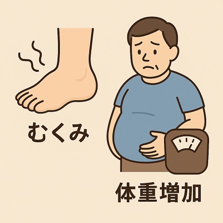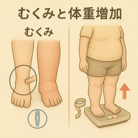 ‐むくみ(浮腫)、体重増加の原因として心不全などの心臓の病気が疑われます。