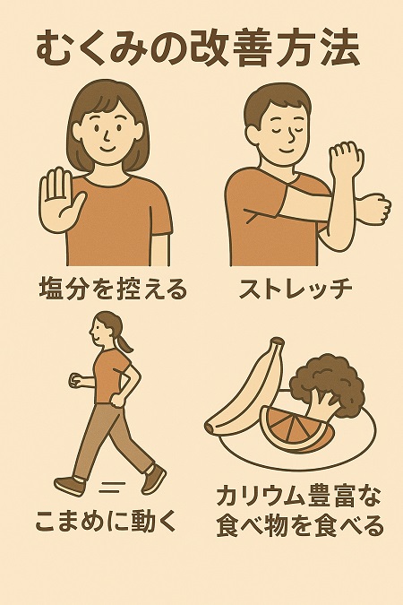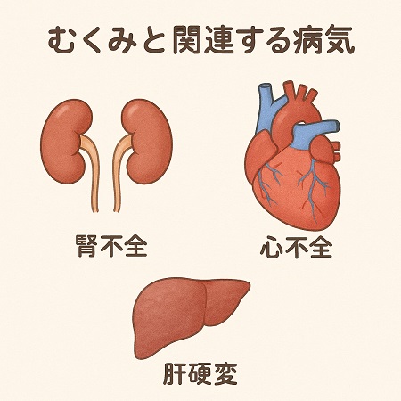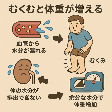 また、血液の循環が悪くなることで腎臓に十分な血液が流れず、尿を作る機能が低下し、体内に水分が溜まりむくみが起こります。