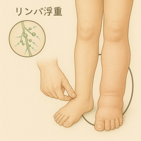 リンパ浮腫:リンパ液の流れが滞ることでリンパ液が組織に溜まり、むくみが現れます。