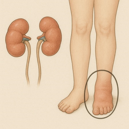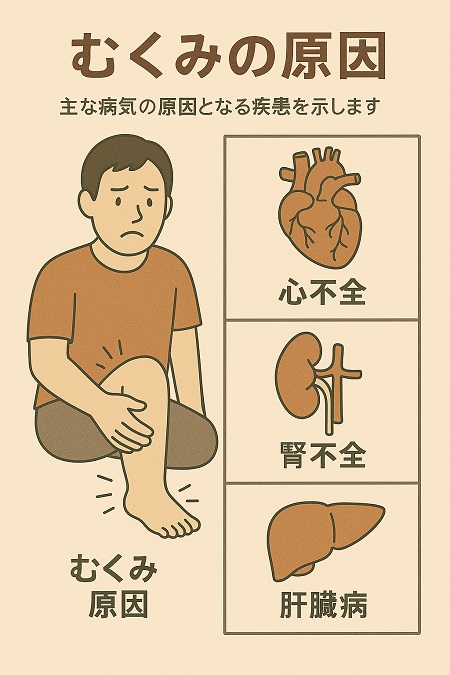 腎不全やネフローゼ症候群などの腎臓の病気:腎不全やネフローゼ症候群などで腎臓機能が低下すると老廃物や余分な水分・塩分が尿として体外へ排出する量が低下し、体内に水分や塩分が溜まり、細胞の間に水分が過剰に貯留することでむくみが現れます。