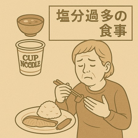 ‐塩分・アルコールの過剰摂取:過剰な塩分を接種で、塩分濃度を薄めるために体は水分を溜め込むことでむくみが起こる