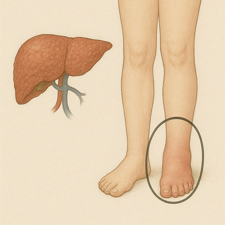 ‐むくみ(浮腫)、体重増加の原因・病気として肝硬変などの肝臓の病気が疑われます。
