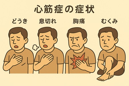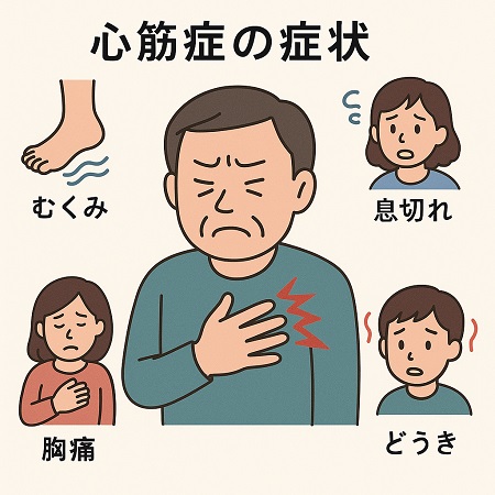 心筋症の症状としては労作時の息切れ、動悸、疲労感、倦怠感、手足のむくみ、呼吸困難、失神(気を失うこと)や、心筋症の病状が進行すると安静時でも動悸や夜間の呼吸困難が生じます