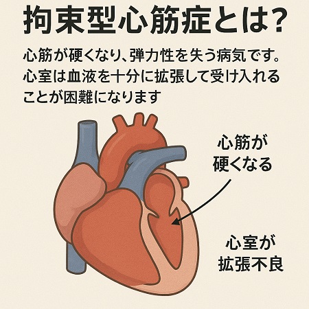 拘束型心筋症とは、心室の壁が硬くなり拡張(心室が血液で満たされる)しにくくなることで、血液を十分に送り出せなくなる心筋疾患(心臓病)です
