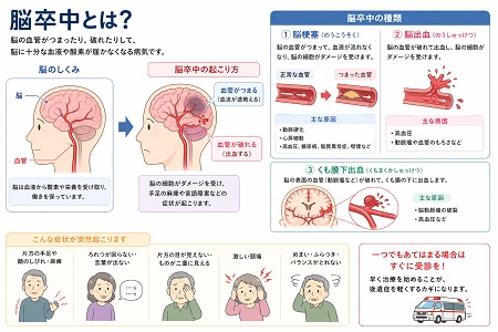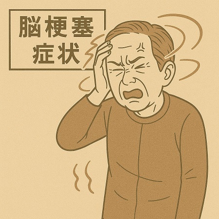 ■脳梗塞によるめまい・ふらつき:わふわする、揺れる、体がグラグラするといった浮動性めまいのほか、周囲が回転するような回転性めまいが起こる。またふらつき・めまいが突然現れ、吐き気やろれつが回らない(言葉が出ない)、しびれ、頭痛などの症状が特徴
