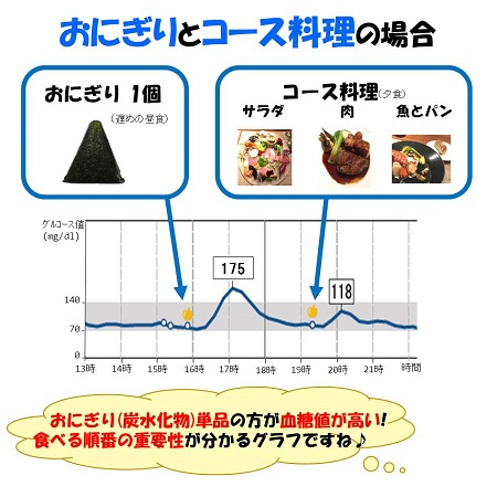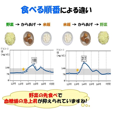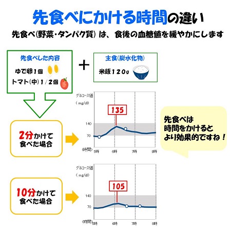 食べる順番を野菜・きのこ類・海藻類から始め、肉・魚などのタンパク質、最後に炭水化物の順に食べることで血糖値の急上昇を抑えることができます。 野菜を先に食べる「ベジファースト」は、野菜に含まれる食物繊維が糖質の吸収を遅らせるため、食後の血糖値の急上昇を防ぐ効果が期待できます。