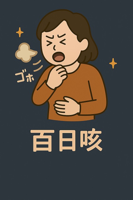 百日咳菌(Bordetella pertussis)の感染によって、特有のけいれん性の激しい咳発作(痙咳発作)を特徴とする急性の気道感染症です。 百日咳菌の潜伏期間(感染してから症状が出るまでの期間)は通常1~2週間ですが、短い場合は4日ほど、長いと3週間程度で季節性はみられず、どの季節でも起こります。コンコンコンというひどい咳が続き、治るまでに数ヶ月かかります。