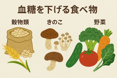 ヘモグロビンA1cを下げるには、食物繊維が豊富な野菜、きのこ、海藻、豆類などを積極的に食事に取り入れ、精製された炭水化物を全粒穀物に置き換えることが効果的です。また、食べる順番を野菜・きのこ類・海藻類から始め、肉・魚などのタンパク質、最後に炭水化物の順に食べることで血糖値の急上昇を抑えることができます。