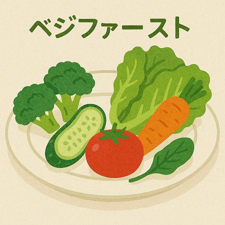 ベジファースト:ベジファーストとは食事の最初に食物繊維が豊富な野菜を食べ、その後にたんぱく質、最後に炭水化物を摂ることで、食後の急激な血糖値の上昇を抑えられます。