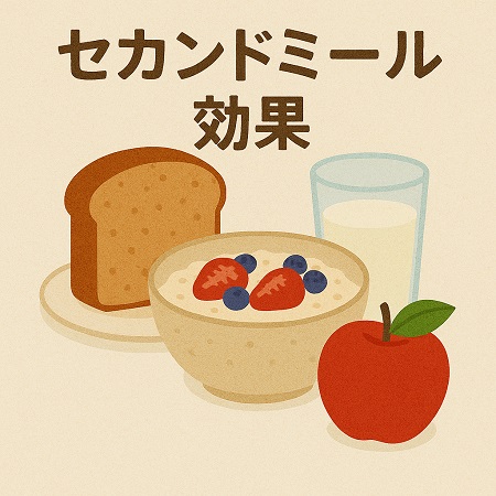 セカンドミール効果とは、ファーストミール(最初の食事の内容)がセカンドミール(次の食事)の血糖上昇に影響を与える現象です。食物繊維(特に水溶性食物繊維)を食べることで胃や腸に作用し、糖の消化吸収を遅らせるたり、ファーストミールでタンパク質(サケ、サバ、マグロなどの青魚、鶏肉、豚肉の赤身部分など)を摂取することで、筋肉が刺激されセカンドミール時に筋肉での糖の吸収が盛んになることで急激な血糖(グルコーススパイク)の上昇を防ぎます。 またセカンドミール効果を高める為には朝食をしっかり摂ることや、食物繊維を意識した食事内容(全粒粉パン、シリアル、野菜、果物)などを多く取り入れる、朝食や間食には卵、大豆製品などのタンパク質を豊富に含む食品を多く摂る、間食を摂ることなども重要です。