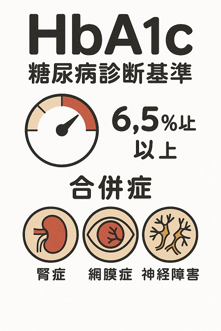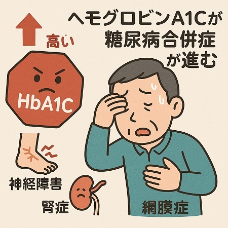 HbA1c(ヘモグロビンA1c)が高いと糖尿病の疑いが強まります。 HbA1c(ヘモグロビンA1c)とは、過去1〜2ヶ月の血糖値を反映する検査値ですので、HbA1c(ヘモグロビンA1c)が高いということは慢性的に高血糖状態が続いているということです。 一般的にHbA1c(ヘモグロビンa1c)が6.5%以上で糖尿病が疑われ、再検査が必要です。HbA1c(ヘモグロビンa1c)が高いと、 血管にダメージが蓄積し、糖尿病の三大合併症である糖尿病性網膜症(視力低下・失明)、糖尿病性腎症(腎機能低下・透析)、糖尿病性神経障害(しびれ・壊疽)が起こりやすくなります。また、動脈硬化が進行し、心筋梗塞や脳梗塞などの重篤な病気につながる可能性もあります。