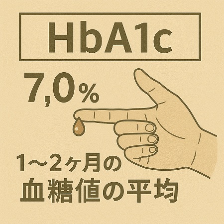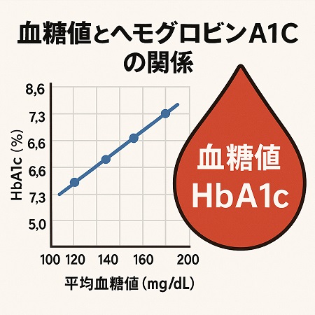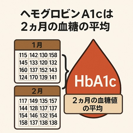 HbA1c(ヘモグロビンA1c)とは、過去1〜2ヶ月の血糖値を反映する検査値で、赤血球中のタンパク質であるヘモグロビンに糖がどれくらい結合しているかの割合 (%) を示します。血糖値が高いほどこの割合は高く、逆に低い状態が続くと低くなります。検査直前の食事の影響を受けないため、糖尿病の診断や血糖コントロールの評価に重要な指標です。