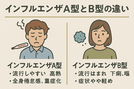 インフルエンザA型は動物にも人にも感染します。A型はインフルエンザウイルスが変異しやすいのが特徴です。インフルエンザB型はヒトにしか感染しません。インフルエンザA型は高熱や全身倦怠感、筋肉痛が強く、重症化しやすく、急激に症状が現れる傾向があります。インフルエンザB型は消化器系の症状(下痢、嘔吐)が出ることが特徴でA型に比べて症状がやや軽めの方が多いです。