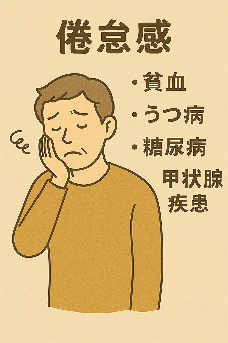 倦怠感やだるさには、過労、睡眠不足、不規則な生活、精神的なストレスの蓄積、栄養不足といった日常生活から生じるものがあります。倦怠感やだるさは通常十分な休養をとることなどで回復しますが、休養しても倦怠感やだるさが解消されず、長い間持続する場合は、何らかの病気が背景にある場合があります。