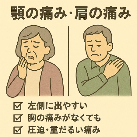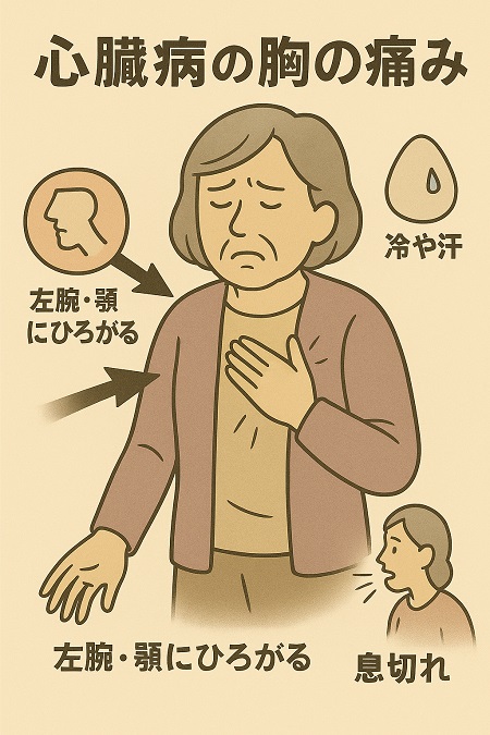心臓病の代表的な症状である胸の痛みは、圧迫感や、締め付けられるような痛みが、時間とともに首、肩、のど、腕、背中などに広がることが特徴です。
