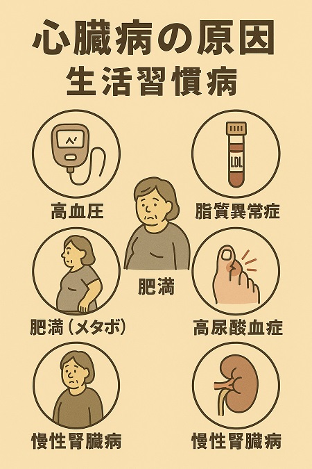 高血圧、糖尿病、脂質異常症、肥満症などの生活習慣病が心臓病の原因である動脈硬化を進行させます。