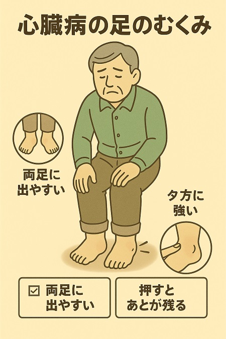 心臓病の代表的な症状であるむくみは、心臓のポンプ機能が弱まり血液が全身に十分に送られず、体の水分が溜まりやすくなることが原因で症状が現れます。 足のむくみが急に強くなった、靴がきつく感じる、1週間で2kg以上の体重増加、夜になるとだるくなる、咳が出る、横になると息苦しい場合には循環器内科に受診してください。