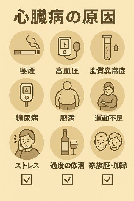 動脈硬化が重症化することで虚血性心疾患を引き起こしますが、日常生活での疲労やストレスが蓄積したり、睡眠不足などが続くことも心臓病発症の引き金になります。風邪が原因となって心筋炎を発症することもあります。