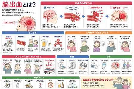 脳出血とは脳の中の細い動脈が高い圧力を受け続けることでもろくなり、破れて出血する疾患です。脳の中に大きな血液の塊ができ、脳の組織を圧迫してダメージを与えます。LDLコレステロール(悪玉コレステロール)が高い方で50歳代以上の方で起こりやすく、脳出血は急に発病することが多く、片側麻痺や手足のしびれ、頭痛、吐き気、嘔吐、頭痛、めまいなどの症状が現れます。