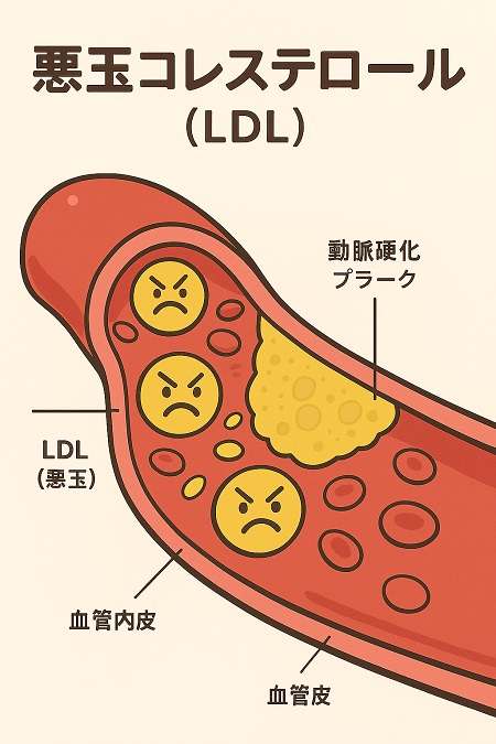 LDLコレステロール(悪玉コレステロール)が高いとコレステロールが全て吸収されず血管壁に沈着し、プラークと呼ばれる物質となり血管が狭くなることで、動脈硬化を進行させます。