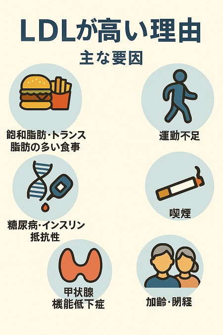 ■飽和脂肪酸やトランス脂肪や糖質の多い食事:動物性油脂(ラード、バター、牛脂)、植物性油脂(パーム油、ココナッツ油)、肉の脂身、乳製品(生クリームやチーズ)、菓子類(バター、ショートニングを使ったもの)、ファストフード、揚げ物、インスタント食品などの過剰摂取が原因でLDLコレステロール(悪玉コレステロール)が高くなります。