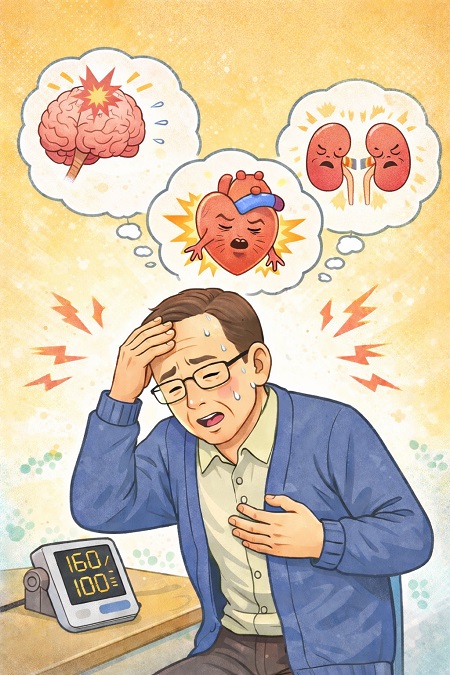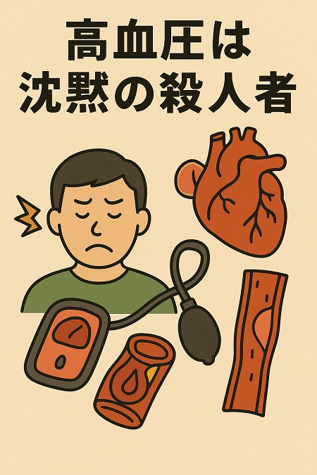 血圧が高くても自覚症状がほとんどないので放置すると血管や臓器にダメージを与え続け、脳卒中や心筋梗塞、心不全、腎不全などの重大な病気を引き起こします。高血圧はサイレントキラー(静かなる殺人者)といわれています