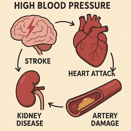 血圧が高いと高血圧の合併症である、動脈硬化が進展し、脳卒中、脳梗塞、くも膜下出血などの脳の合併症、心筋梗塞、狭心症、心不全などの心臓の合併症、慢性腎臓病、腎不全などの腎臓の合併症、高血圧性網膜症などの目の合併症を引き起こします