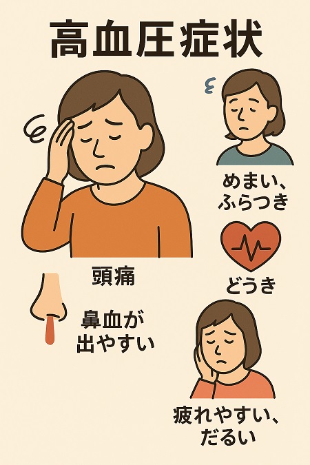 血圧が高くても多くは無症状ですが、クラクラ・ふわふわした感じがしたり、鈍い痛みや圧迫感のある頭痛(後頭部の頭痛)、肩こり(長く続く強い痛みが続く肩こり)、動悸、耳鳴り、めまい、吐き気、息切れ(運動後や安静時でも息苦しい)、麻痺、手足のむくみ、背中の痛み、会話ができない、片方の手足が動かしにくい、手足が動かせないなどの症状が現れます。