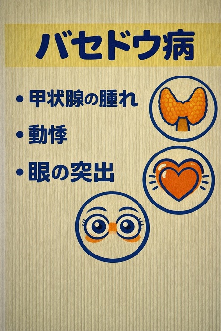 甲状腺亢進症やバセドウ病になると、甲状腺ホルモンが過剰分泌され体の代謝が活発になり心拍を自覚できるほどの動悸や体温の上昇が起こります。またエネルギーが大量に消費されることで、いつもどおり食べていても体重減少が起こります。甲状腺亢進症は男性よりも女性、特に若い女性に多く見られます。