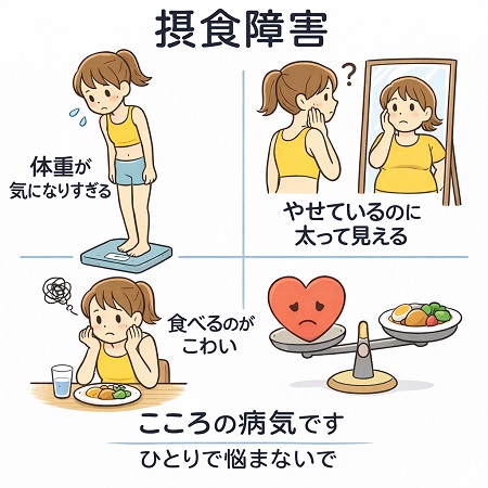 摂食障害(神経性食欲不振症・拒食症など)になると、体重が増加することへの強い不安や恐怖心で、食事(食べ物)をうけつけなくなります。 摂食障害(拒食症)になると、時に食べたいという欲求が抑えられなくなり一時的に沢山食べて、その後に嘔吐して体重の増加を防ぐこともあります。