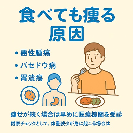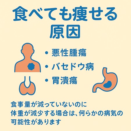 いつも通り食べても痩せる、急に体重が減少する原因・病気には、糖尿病、甲状腺亢進症、バセドウ病、悪性腫瘍(胃がん・大腸がん・すい臓がんなど)、慢性胃炎、胃・十二指潰瘍、炎症性腸疾患(クローン病・潰瘍性大腸炎)、摂食障害(神経性食欲不振症・拒食症など)やうつ病など様々な疾患が考えられます。
