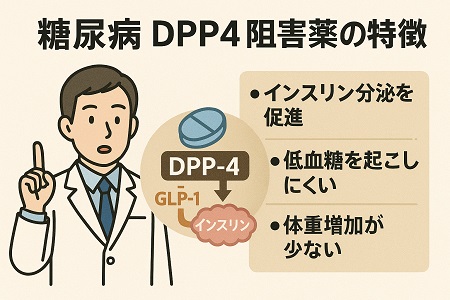 - ・主な作用:インクレチン分解抑制 特徴:食後高血糖抑制・単独では低血糖が少ない。インクレチンというホルモンを分解する酵素「DPP-4」の働きを抑えることで、インクレチンが長持ちさせる。血糖値が下がるメカニズムとして高血糖時にインスリン分泌を促進し、グルカゴン分泌を抑制し結果として血糖値が下がる