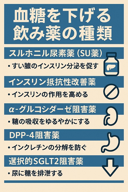 血糖値を下げる飲み薬はインスリンを出しやすくする薬とインスリンを効きやすくする薬、糖の吸収・排泄を調整する薬の3つのタイプがあります