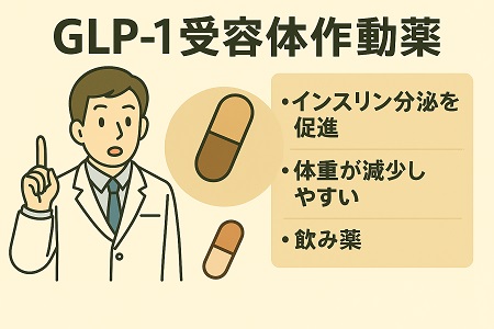 薬物療法には、飲み薬による治療とインスリン・GLP-1受容体作動薬の自己注射療法の二つがあります。